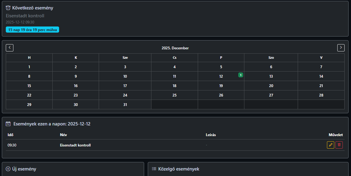 • Esemény felvétel: név, dátum, idő, leírás