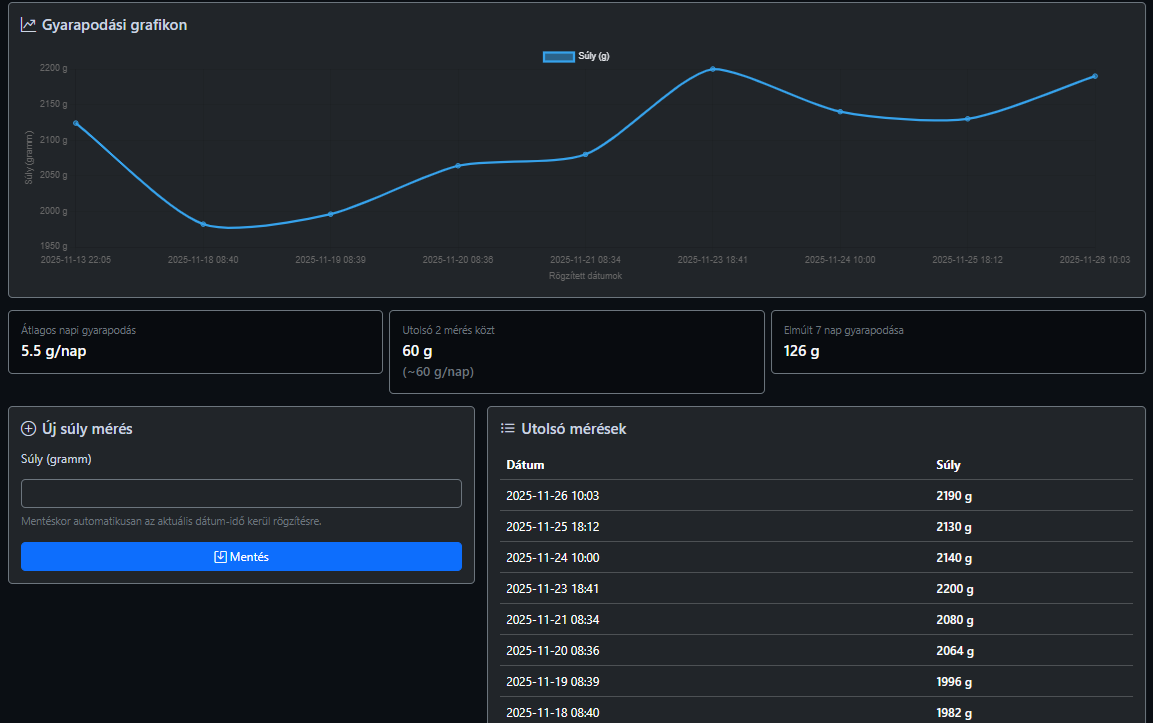 Gyarapodási grafikon + átlagok, utolsó mérések listája.