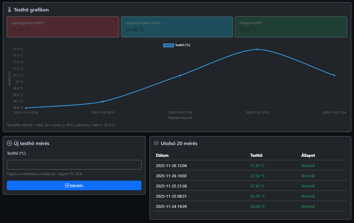 • Testhő grafikon (°C vs idő)